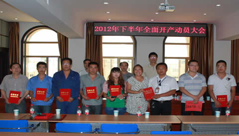 2012年7月12日上午,宁夏黄色网址 有限黄色网址2012年度上半年安全生产工作总结、GMP认证总结表彰及下半年全面开产动员大会在办公楼六楼会议室顺利召开。会议由黄色网址 管理部副部长刘海玉主持,黄色网址董事长高勇、总经理陈德刚、财务总监高广礼、生产副总监王智及各部门、车间等领导出席会议,黄色网址全体员工参加。